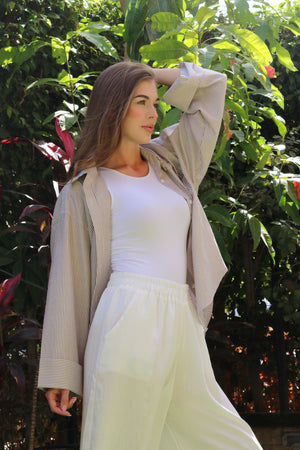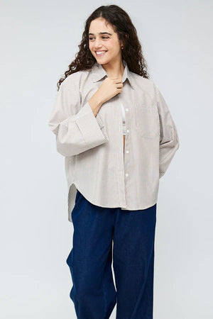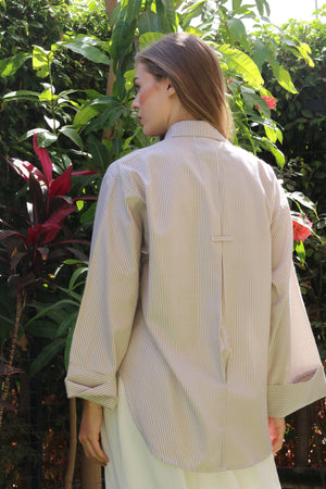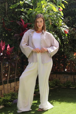 The Casual Striped Oversized Shirt is a timeless wardrobe essential that blends effortless style with comfort. Designed in a soft colors with delicate white stripes, this relaxed-fit shirt drapes beautifully over any outfit.