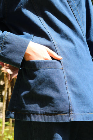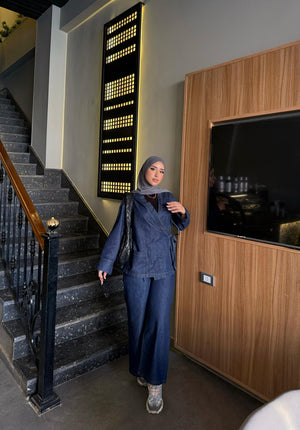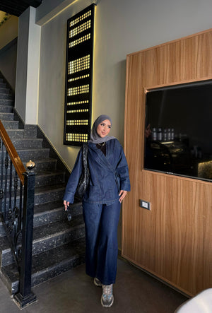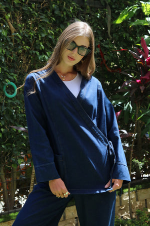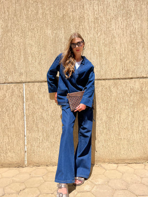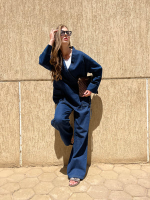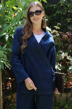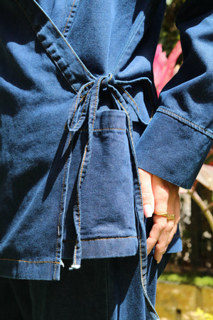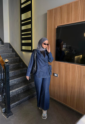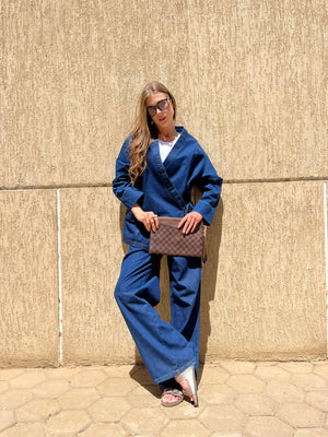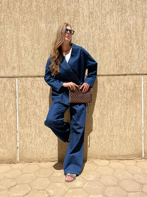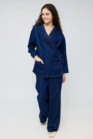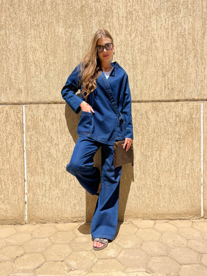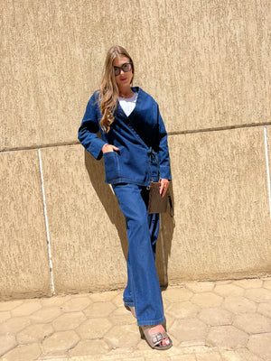 This stylish denim set features a wrap-style top with a side tie and large front pockets, paired with wide-leg pants for a relaxed yet chic look. The dark blue color adds a touch of sophistication, making it perfect for both casual and semi-formal occasions.
