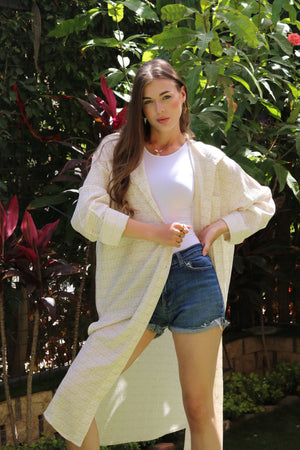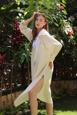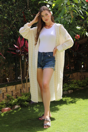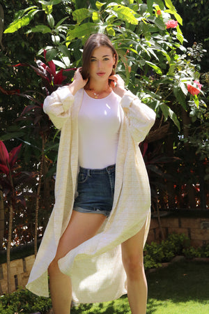 The Sandy Breeze Hooded Shirt Dress is the ultimate blend of elegance and casual comfort. Crafted from textured, breathable fabric, this long, light beige shirt dress drapes effortlessly over your outfit, adding a refined touch to your everyday look.