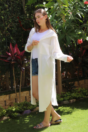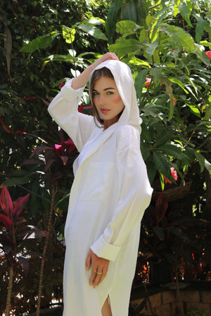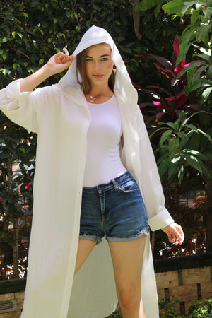 The Elegant Summer Breeze Shirt Dress is a versatile and stylish piece perfect for warm weather. Made from lightweight, breathable fabric, this shirt dress features a long, flowing design with a hood for added flair.